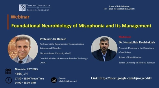 دانشکده توانبخشی دانشگاه علوم پزشکی تهران با همکاری معاونت بینالملل دانشگاه، وبینار تخصصی بینالمللی با موضوع Foundational Neurobiology of Misophonia and Its Management برگزار میکند.