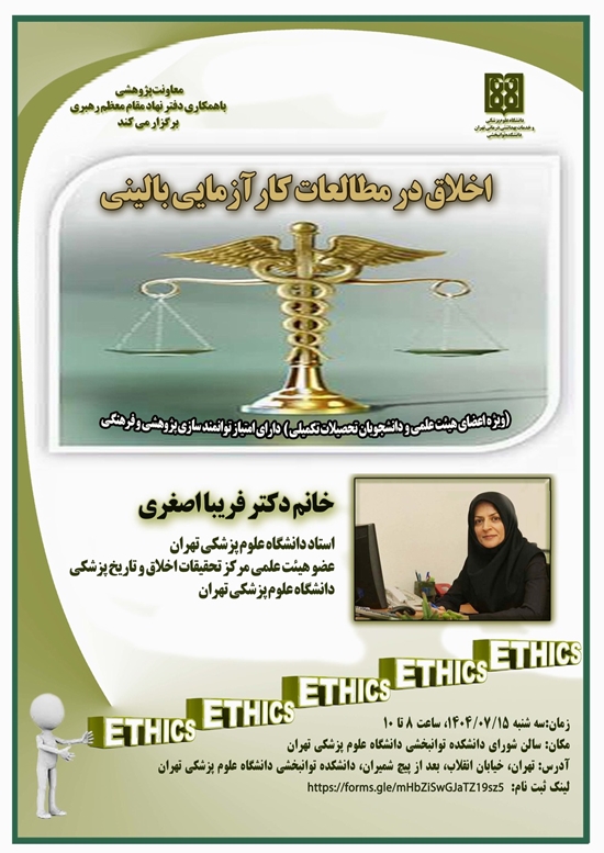 کارگاه اخلاق در مطالعات کارآزمایی بالینی با تدریس دکتر فریبا اصغری، استاد دانشگاه علوم پزشکی تهران، روز سهشنبه ۱۵ مهرماه ۱۴۰۴ در سالن شورای دانشکده برگزار میشود.