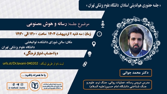 به گزارش روابط عمومی دانشگاه علوم پزشکی تهران، نشست حضوری هماندیشی استادان با موضوع «رسانه و هوش مصنوعی» با سخنرانی دکتر محمد جوانی، مدرس دروس رسانه، عملیات روانی، جنگ نرم، علوم و جنگ شناختی، ارتباطات و تعاملات اجتماعی در دانشگاه امام حسین (ع)، برگزار میشود.